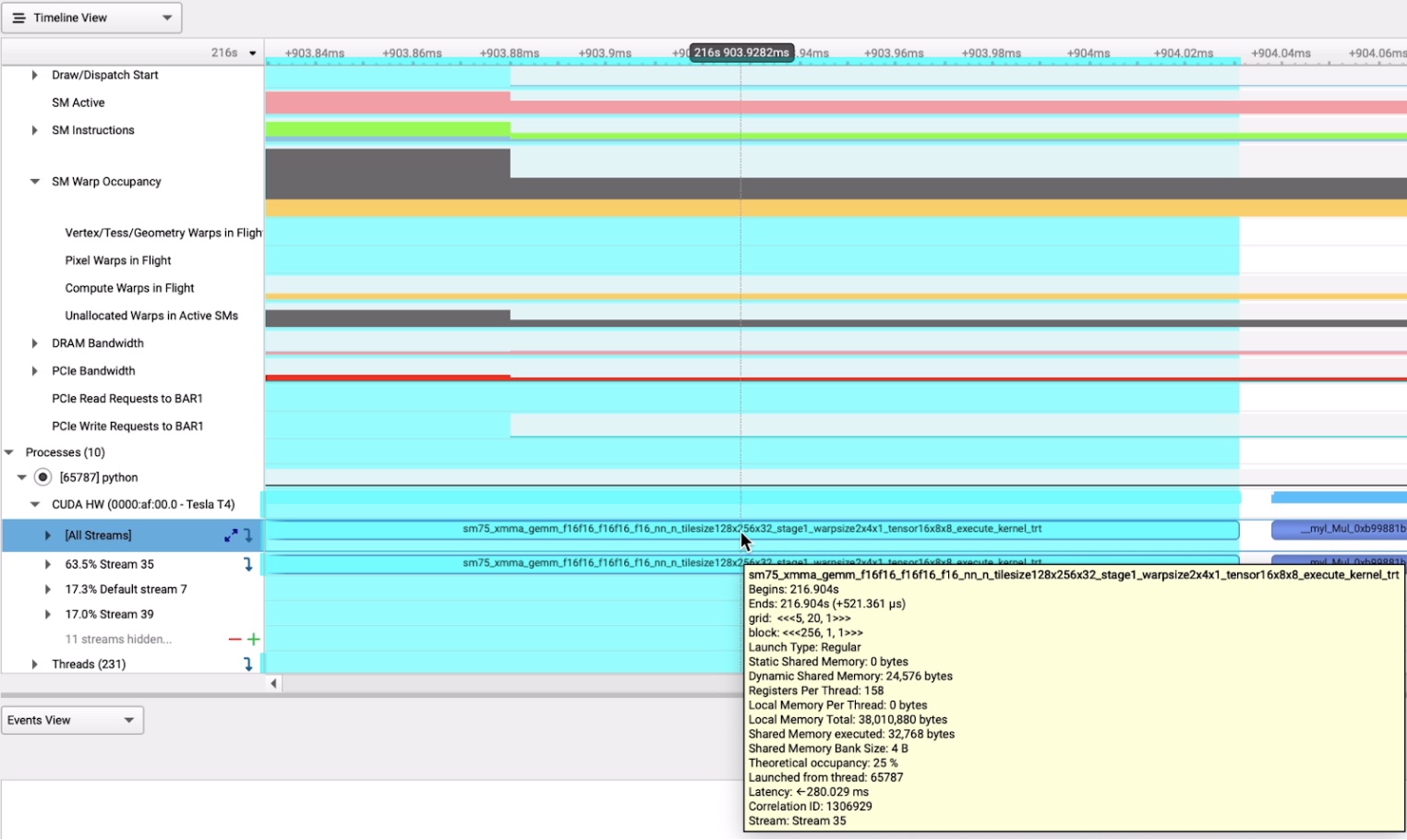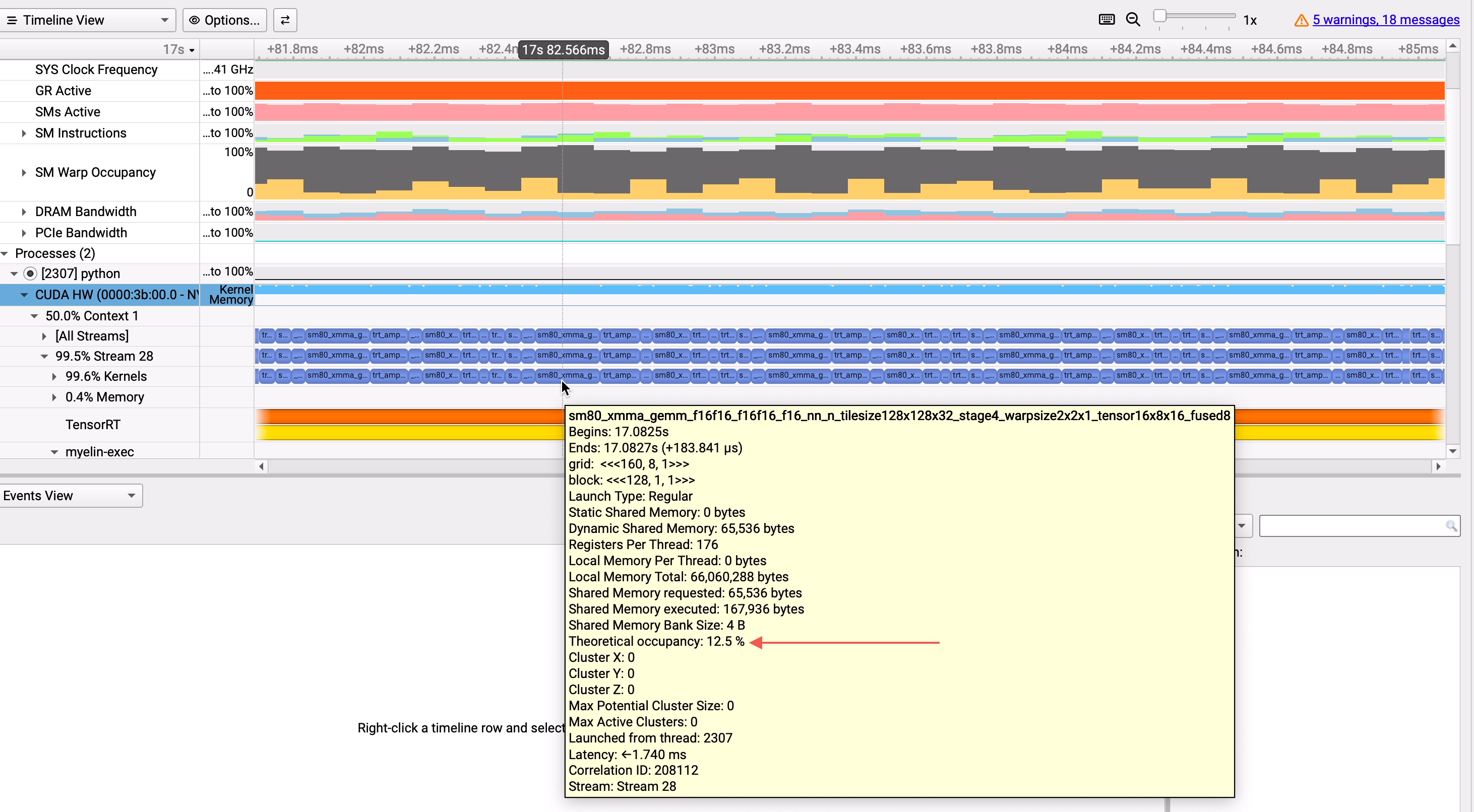 需要注意的是活动 Warp 存在上限,因此占用率也存在上限,该上限可从启动配置、内核的编译选项和设备功能中得出。内核启动的每个块都会分发到其中一个 SM 进行执行。从块的 Warp 开始执行到块中的所有 Warp 都退出内核为止,该块被视为处于活动状态。SM 上可并发执行的块数受以下列出的因素限制。活动 Warp 的上限是活动块的上限与每个块的 Warp 数的乘积。因此,可以通过增加每个块的 Warp 数(由块尺寸定义)或更改限制 SM 上可容纳多少块的因素以允许更多活动块来提高活动 Warp 的上限。限制因素包括:每个SM的warp数,每个SM的block数,每个SM的寄存器数和每个SM的shared memory数。也就是说你写一个kernel用了多少资源,如何设置了启动参数等等都会影响这个占用率。这个就是占用率上线就是Theoretical Occupancy。 当你使用Nsys进行性能profile的时候,鼠标移动到执行的kernel处你会看到显示的Theoretical Occupancy值。