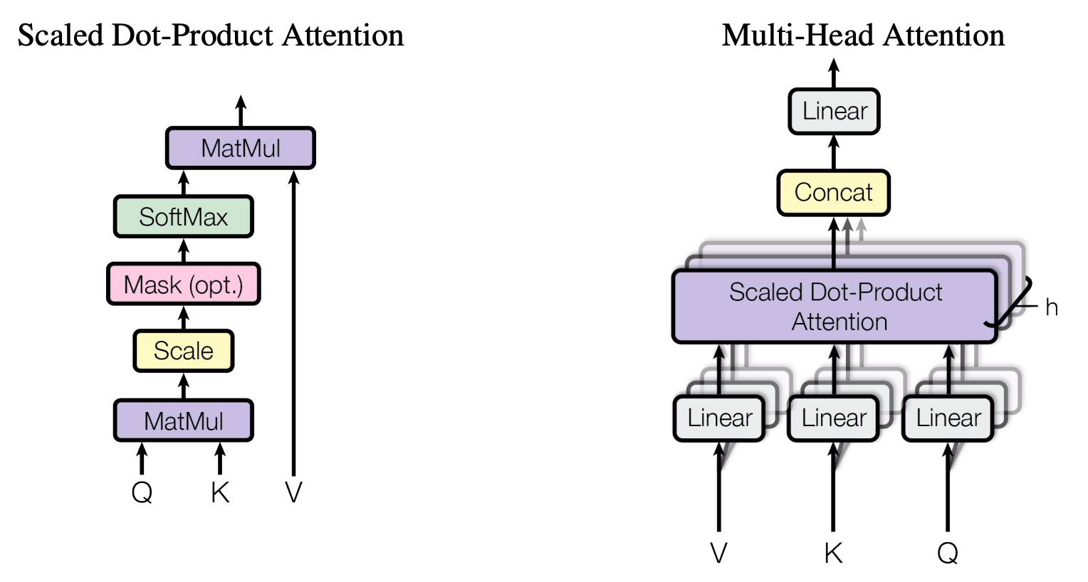 实际上就是之前介绍的注意力的直接表达。 要注意的是这里的相似度量采用的是内积。根据论文中的介绍,最常用的两种注意力函数是加法注意力和点积(乘法)注意力。除了 \(\frac{1}{\sqrt{d_k}}\) 这里的\(d_k\)表示的是输入\(K\)的维度 的缩放因子外,点积注意力与SDPA算法相同。加法注意力使用具有单个隐藏层的前馈网络计算兼容性函数。虽然两者在理论复杂度上相似,但点积注意力在实践中更快、更节省空间,因为它可以使用高度优化的矩阵乘法代码来实现。虽然对于较小的 \(d_k\) 值,这两种机制的表现相似,但对于较大的 \(d_k\) 值,加法注意力优于没有缩放的点积注意力。原因可能是对于较大的\(d_k\) 值,点积的结果值会变大,从而将 softmax 函数推入具有极小梯度的区域。为了抵消这种影响,将点积注意力引入缩放因子\(\frac{1}{\sqrt{d_k}}\) 。