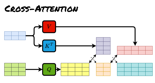cross-attention意思是\(Q\)和\(K,V\)来自于不同的序列,换句话说,交叉注意力机制将两个具有相同维度的不同嵌入序列组合在一起,从一个序列中获取查询,从另一个序列中获取键和值。
