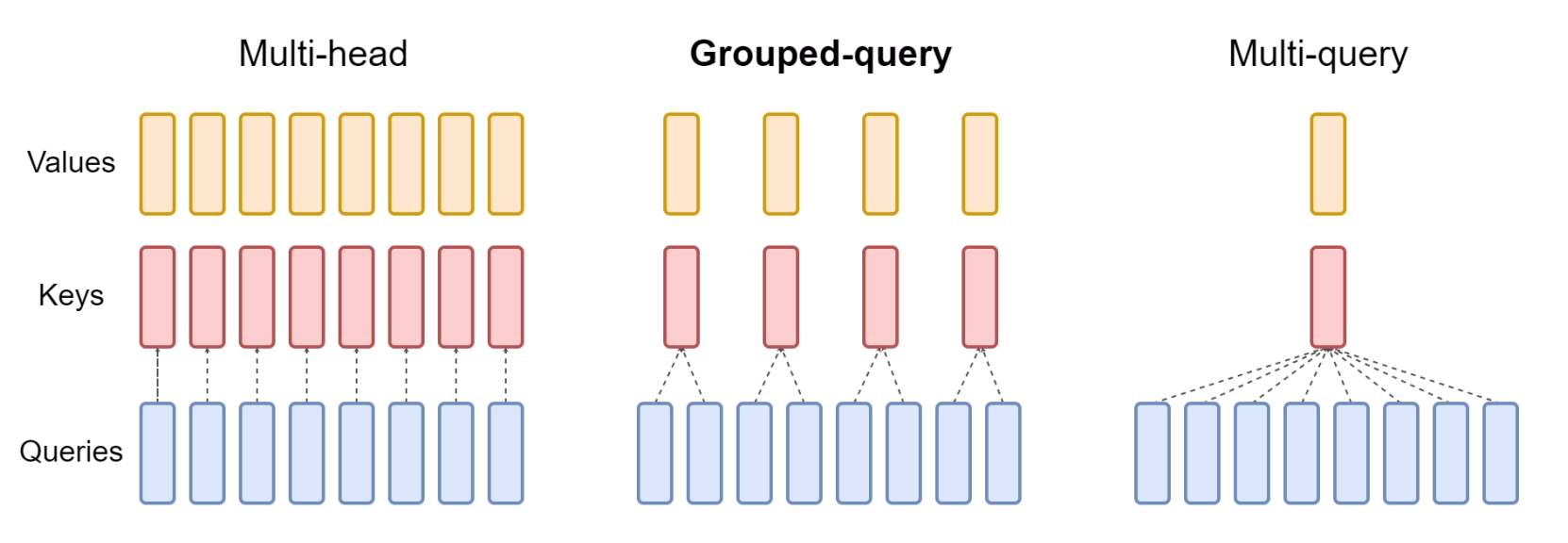 然而,也有人担心MQA对KV Cache的压缩太严重,以至于会影响模型的学习效率以及最终效果。为此,一个MHA与MQA之间的过渡版本GQA(Grouped-Query Attention)应运而生。事后看来,GQA的思想也很朴素,它就是将所有Head分为g个组(g可以整除h),每组共享同一对K、V,g=h的时候就是MHA,g=1的时候是MQA.