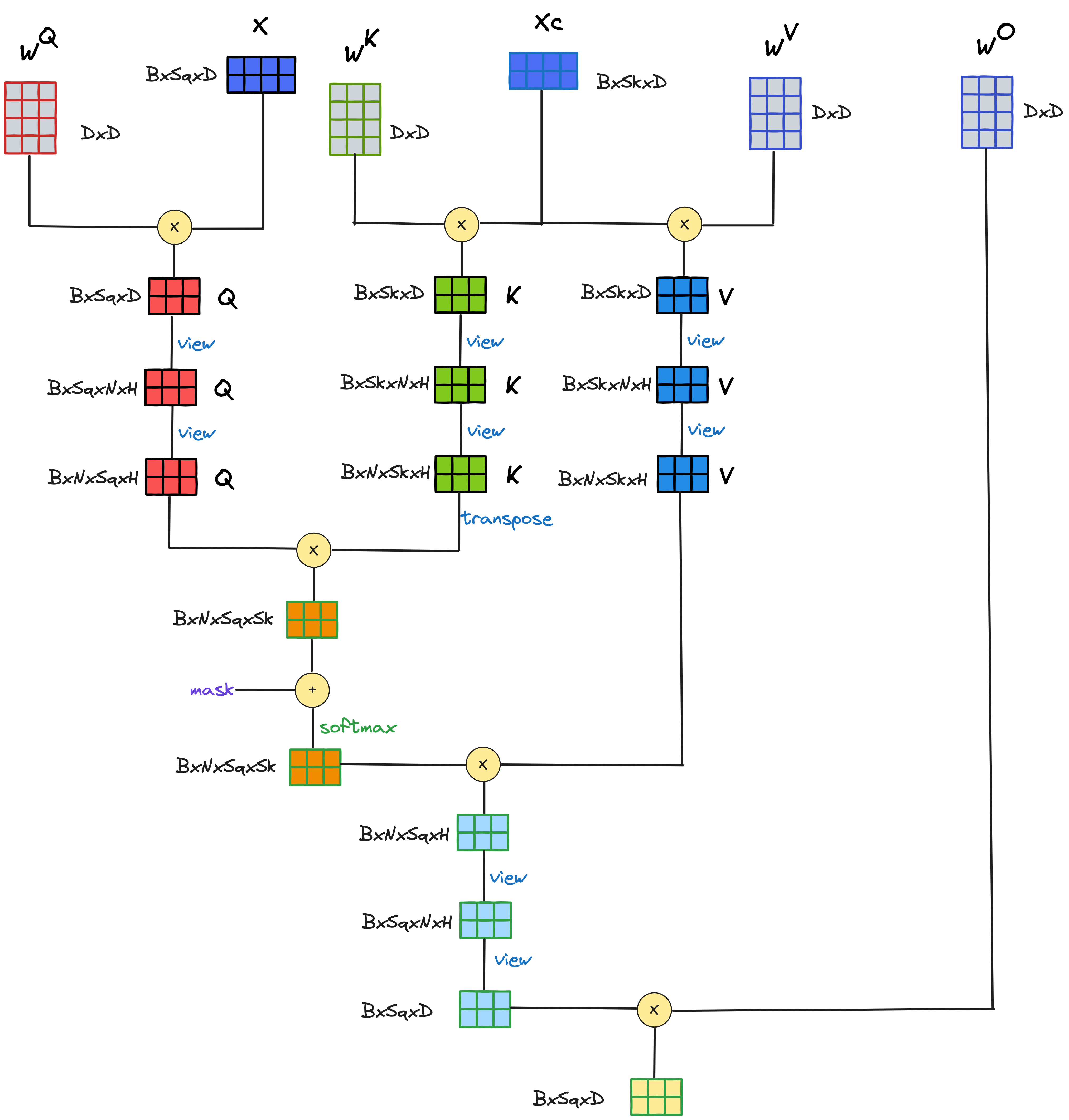 \[\begin{array}{l|l} \text { symbol } & \text { dimension } \\ \hline \text { B } & \text { batch } \\ { S_q } & \text { sequence length (query) } \\ { S_k } & \text { sequence length (key value) } \\ \text { D } & \text { d_model, embedding dimension } \\ \text { H } & \text { attention head dimension } \\ \text{N} & \text { number of heads } \\ \end{array}\]实际运算过程如下: