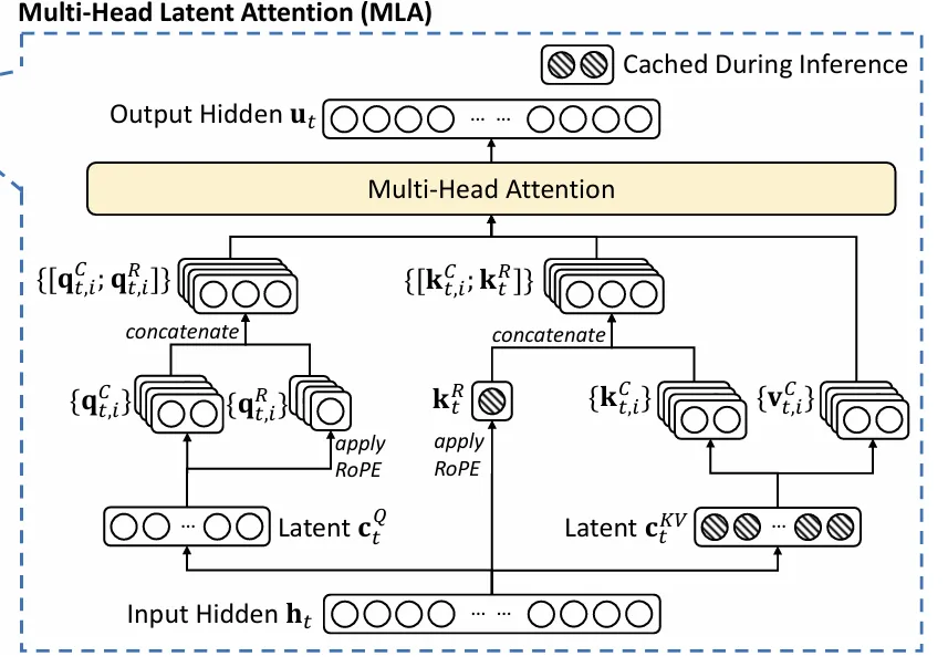 MLA可以参考苏神的文章了解详细的推导和解释 的性能优于 MHA,同时显著降低了 KV 缓存增强推理效率。MLA 不会像 MQA 和 GQA 那样减少 KV 头,而是将键和值联合压缩为潜空间量。
