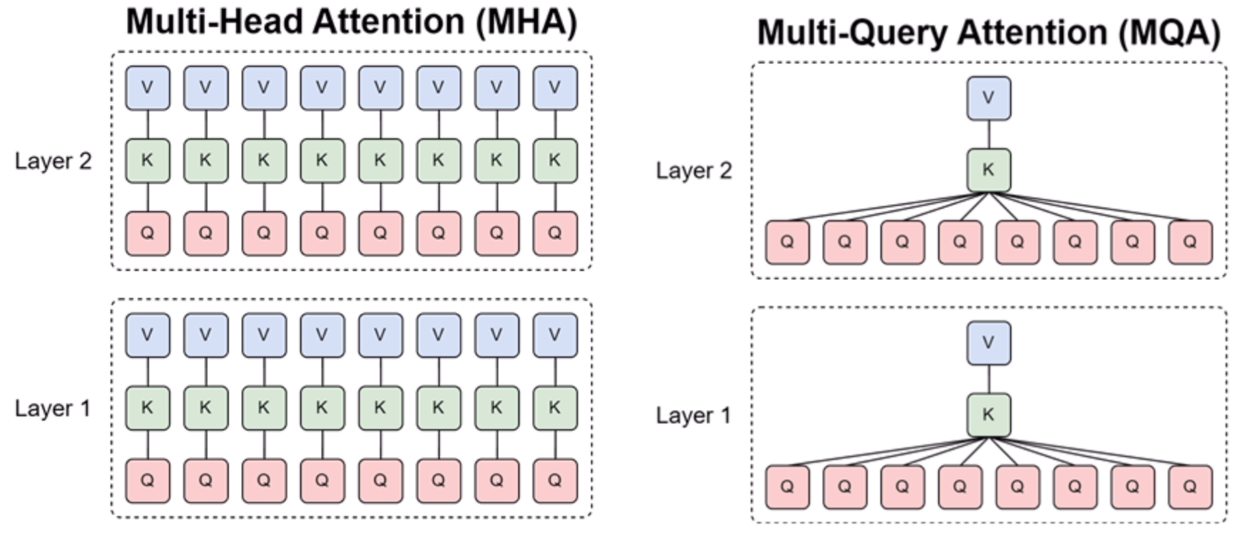 MQA的思路很简单,直接让所有Attention Head共享同一个\(K,V\),是为了解决MHA中KV Cache过大的问题,MQA直接将KV cache减少到了MHA的\(\frac{1}{h}\),体现在公式上是: