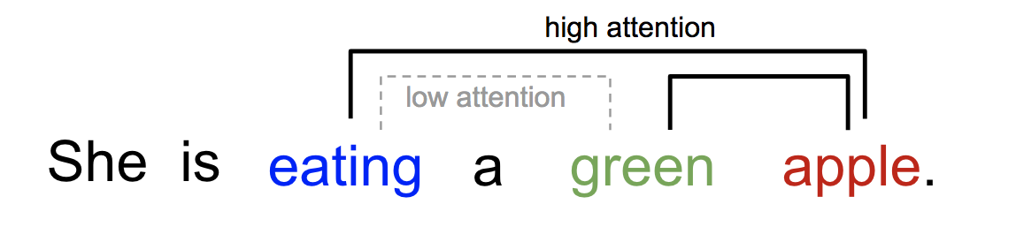 类似的,我们可以在一个句子或密切上下文中解释单词之间的关系。当我们看到“eating”时,我们期望很快就会遇到一个描述食物的词。虽然颜色也描述了食物,但可能与“eating”不太直接相关。