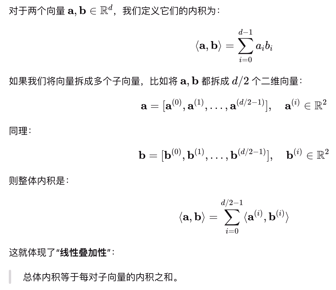 \[R_f(\boldsymbol{q}, m) R_f(\boldsymbol{k}, m)=R_g(\boldsymbol{q}, \boldsymbol{k}, 0)=R_f(\boldsymbol{q}, 0) R_f(\boldsymbol{k}, 0)\]因为同时对两个向量加相同的旋转位置编码(同一个 m)后,它们的内积是不变的!
