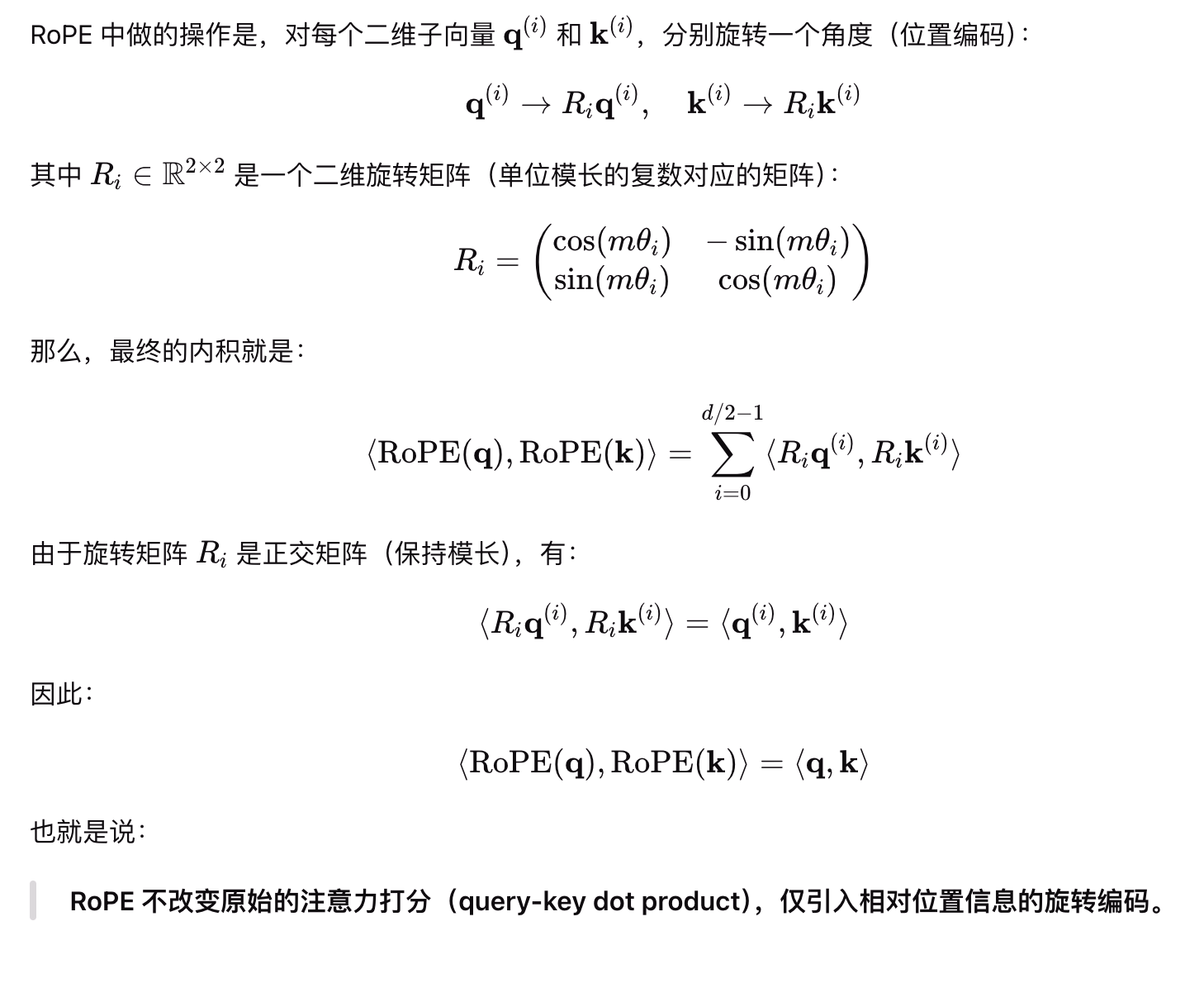 RoPE 的设计目的正是解决这一点 —— 它让两个 token 在 dot-product 过程中,自然地体现出它们之间的相对距离(角度差),从而在注意力分数中直接注入相对位置信息。