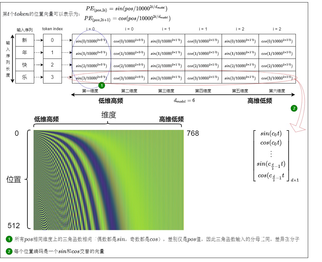 \[\begin{aligned} \text{PE}_{(pos, 2i)} = \sin\left(\frac{pos}{10000^{\frac{2i}{d_{\text{model}}}}}\right) \\ \text{PE}_{(pos, 2i+1)} = \cos\left(\frac{pos}{10000^{\frac{2i}{d_{\text{model}}}}}\right) \\ \end{aligned}\]其中:
