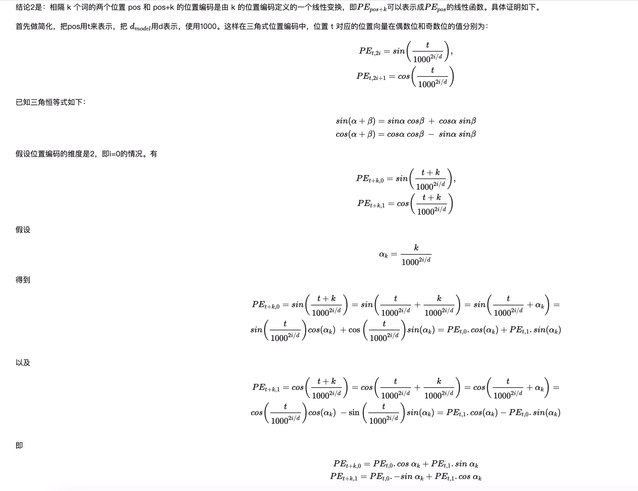 正弦位置编码中有个非常好的性质是可以反应出相对位置关系。意思是对于相对位置间距\(k\),\(PE_{(pos, k)}\)是\(PE_{(pos)}\)的线性组合,也就是\(PE_{(pos, k)}\)可以用\(PE_{(pos)}\)计算得到。它能反应出相对位置关系,也就是说,你可以通过对向量进行某种变换来捕获相对位移的信息,这是一种隐式的相对位置编码能力。它之所以成立,是因为这些正余弦函数具有良好的平移不变性质。但是它并不显式建模相对位置信息,因此不是一种相对位置编码。