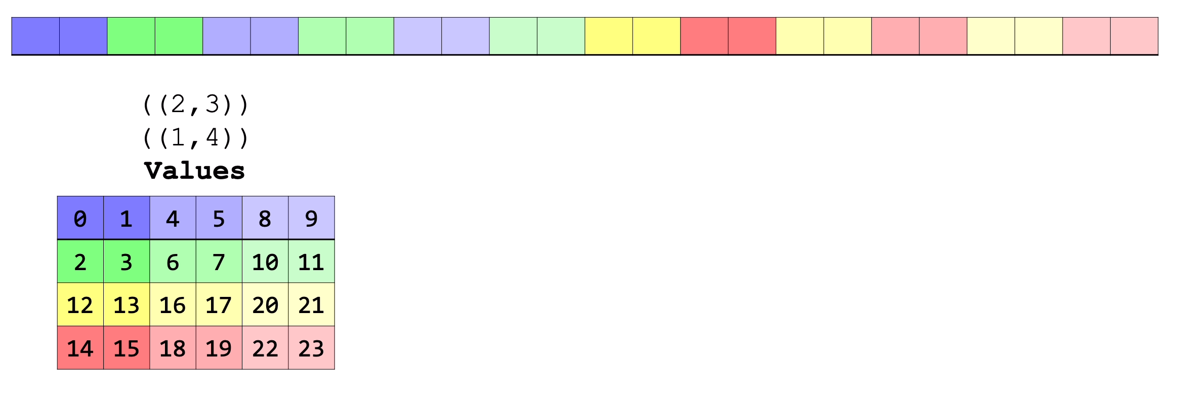 如上所示,假设有一个一维的内存数据,总共有24个,每个线程要读的数据以不同的色块表示,也就是说每个线程读6个数据,以第0个线程为例,它读的数据就是第0,1,4,5,8,9个数据。这样分,总共需要24/6=4个线程,也就是4个线程读24个数据,每个线程读6个数据,每个线程读的数据是有分布的,线程本身也是有分布的,也就是如下所示的样子。 感觉这个layout 应该是((2,2),(3,2):(12,2),(4,1))才对,不过就是为了方便理解而已