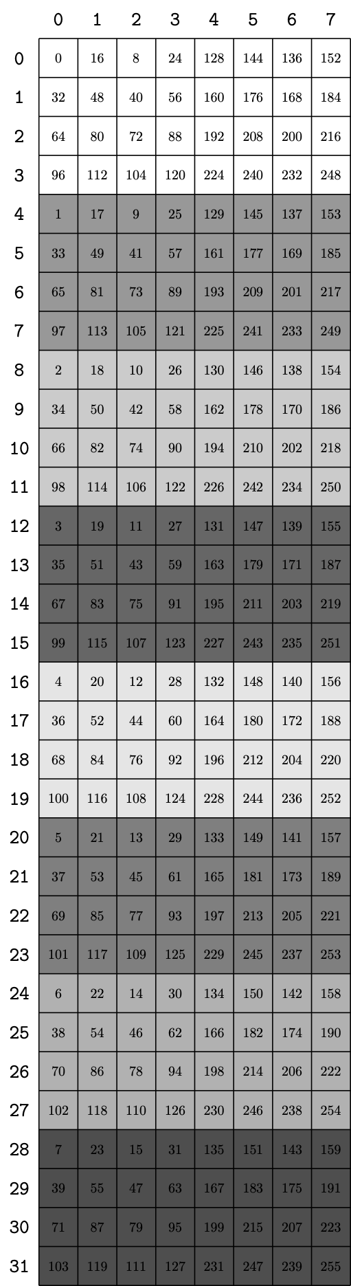 图中左侧行方向32个数字表示的线程id,上侧列方向的数字表示的value的坐标。 以thread 0为例, thread 0 负责的数据的坐标是 0, 16, 8, 24, 128, 144, 136, 152. 这些坐标都数据铺平后的一维坐标,如何对应到16X16的矩阵中呢? 那么假设A矩阵是列主序的,也就是A矩阵的内存是列主序排列,那么 0, 16, 8, 24, 128, 144, 136, 152 这些坐标对应矩阵的哪一行哪一列呢? 其实就很好计算了